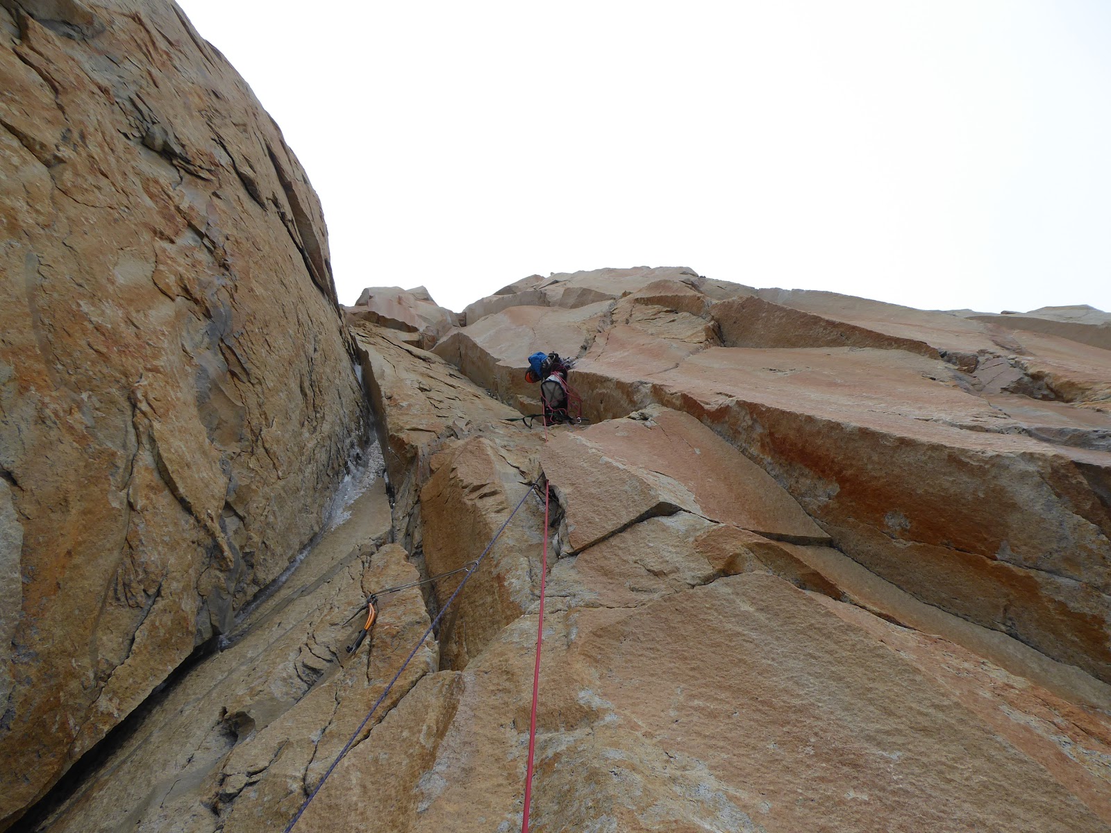 lleva varias horas escalando el largo, hace frío y mucho viento. A mi derecha hay un glaciar colgado